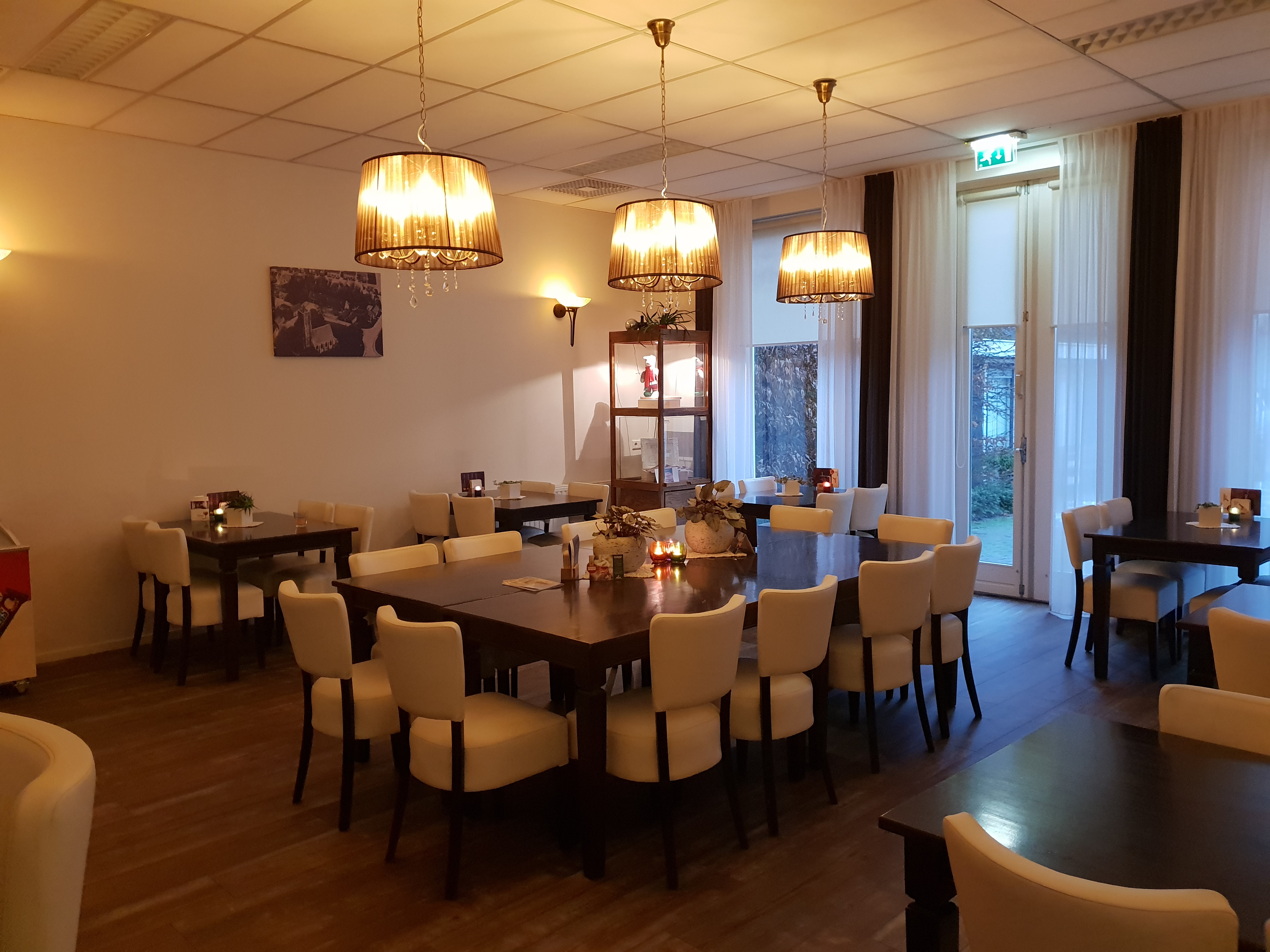 Deze zaal heeft een uitzicht op het terras, bij mooi weer staan de prachtige grote deuren open.